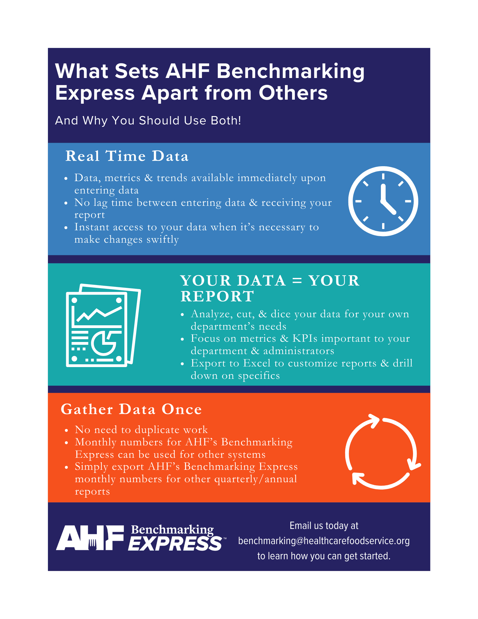 AHF’s Benchmarking Express™ is a robust online program offering streamlined reporting, performance indicators, reports, statistics, and trend graphs that drive success. The program is free to AHF’s self-operated acute care and senior dining members. It is a sophisticated system where members can enter monthly data points and analyze their operation across up to 30 Key Performance Indicators (KPI). It goes beyond a simple annual dashboard of industry metrics, giving your operation data a home while providing real-time benchmarking functionalities.