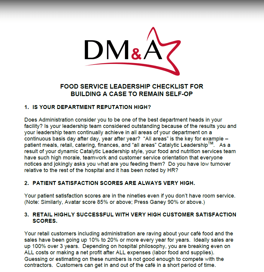 A foodservice leaders checklist for building a case to remain self-operated. This document will walk you through 12 steps and checkpoints to ensure your foodservice and nutrition department stay self-operated.