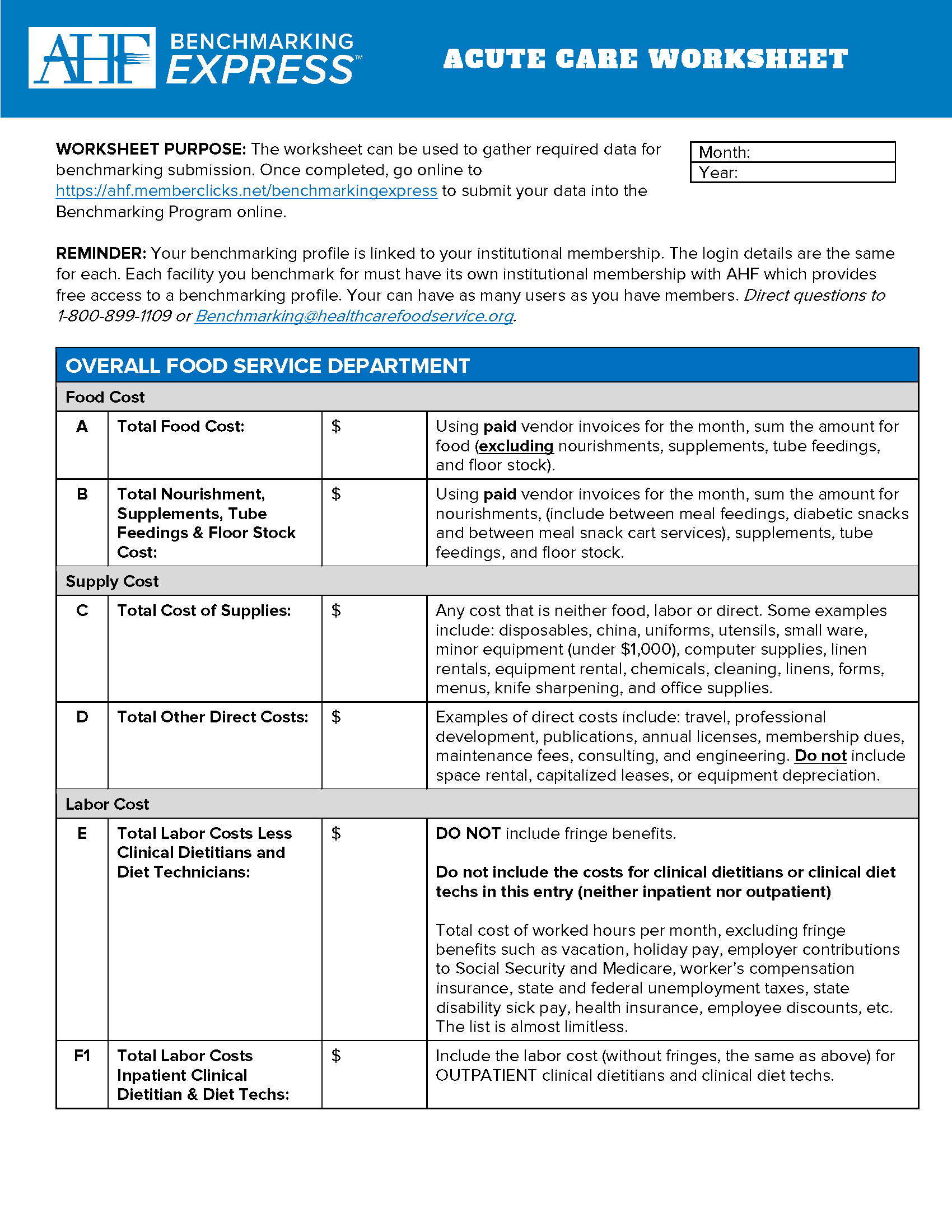 The worksheet can be used to gather the required data for benchmarking submission. It is used to help understand the metrics and what is included in each data point submitted into AHF's Benchmarking Express program.