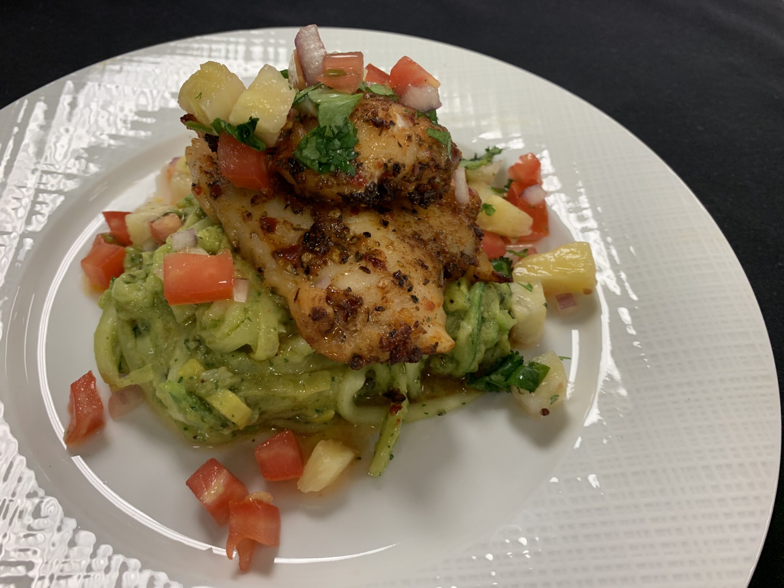 This dish is a classic Floribbean cuisine item. Grouper is an abundant fish found in the waters off of the Florida coast, alongside some of the best known crops of oranges and tomatoes. With an avocado pesto, changing the classic pesto sauce to avocado base, creates a sauce that compliments the smokiness and spiciness of the grouper, and the cooling crisp sensation of the salsa on top ties the dish together. Perfect for a heart healthy, lean menu item and highlighting the delicate taste of grouper.