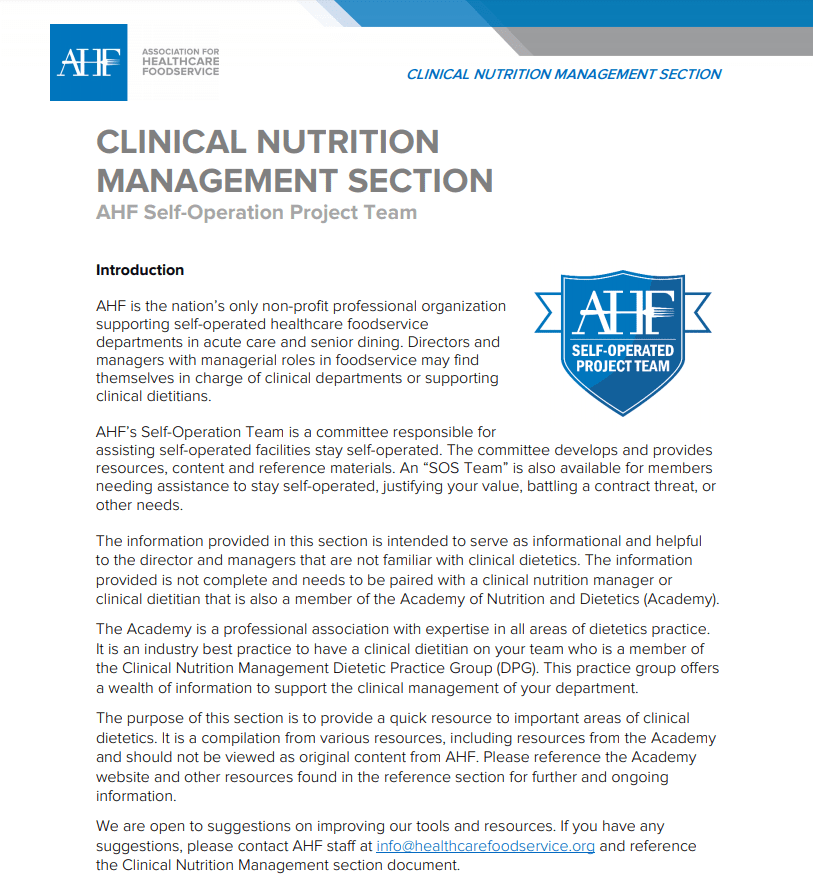 The information provided in this section is intended to serve as informational and helpful to the director and managers that are not familiar with clinical dietetics. The purpose of this section is to provide a quick resource to important areas of clinical dietetics. It is a compilation from various resources.