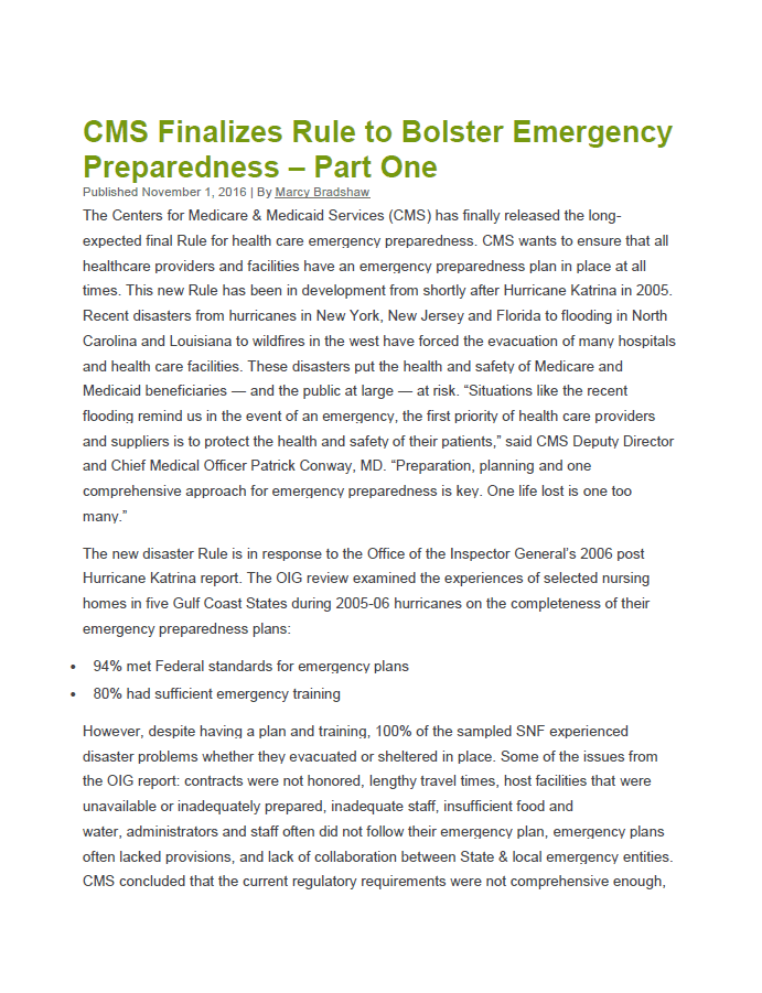 An outline of CMS releases final Rule for healthcare emergency preparedness.