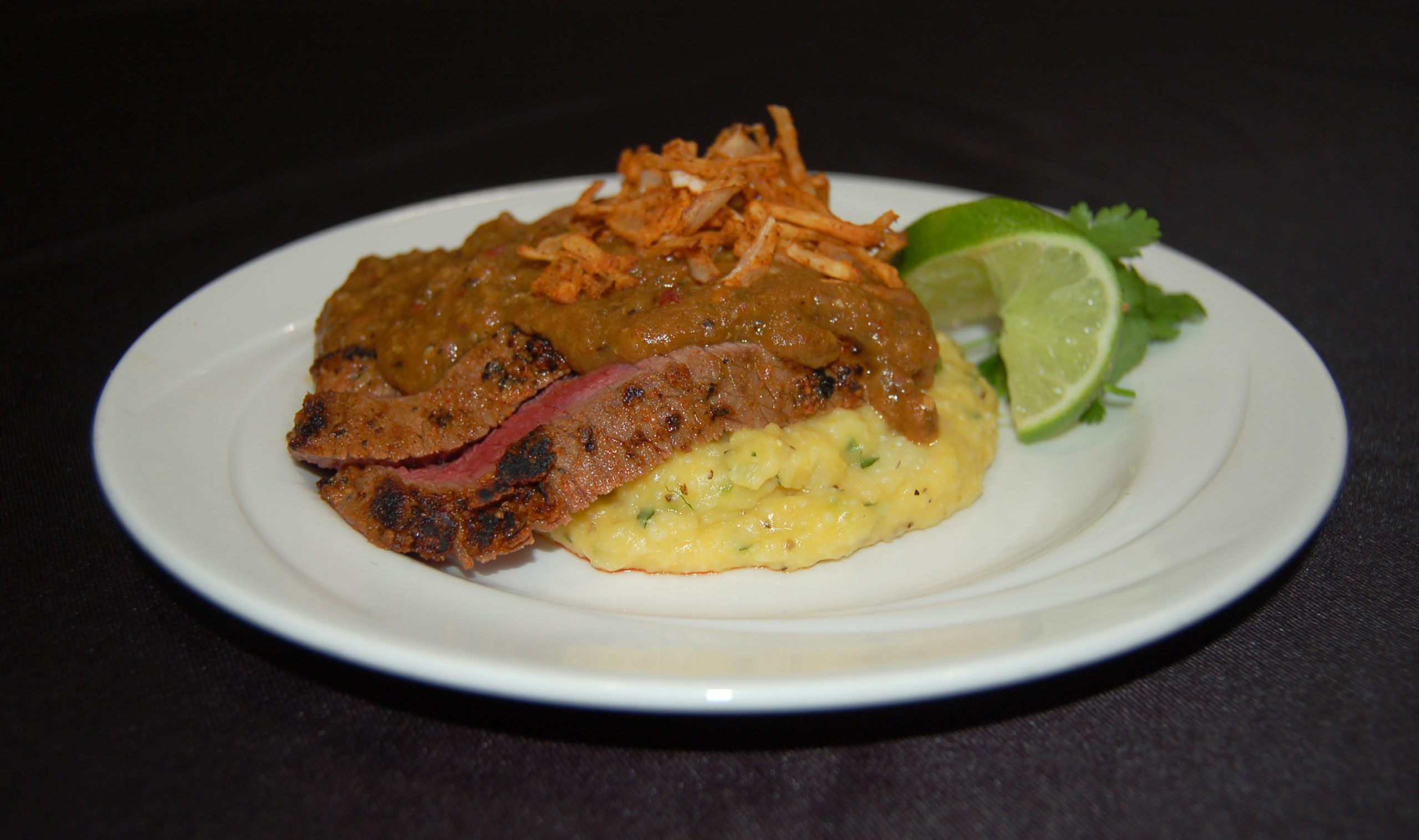 Grilled spice rubbed flank steak served over cheesy potato grits with a dark chocolate roasted poblano mole sauce, garnished with potato onion frites.