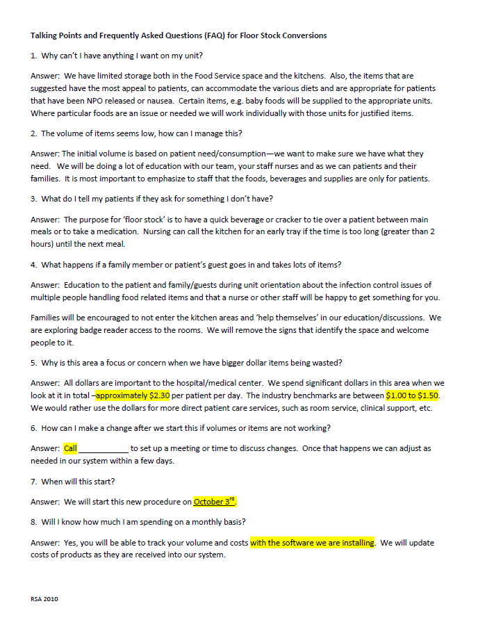 A document outlining FAQs for floor stock conversions developed and provided by Ruck Shockey Associates).