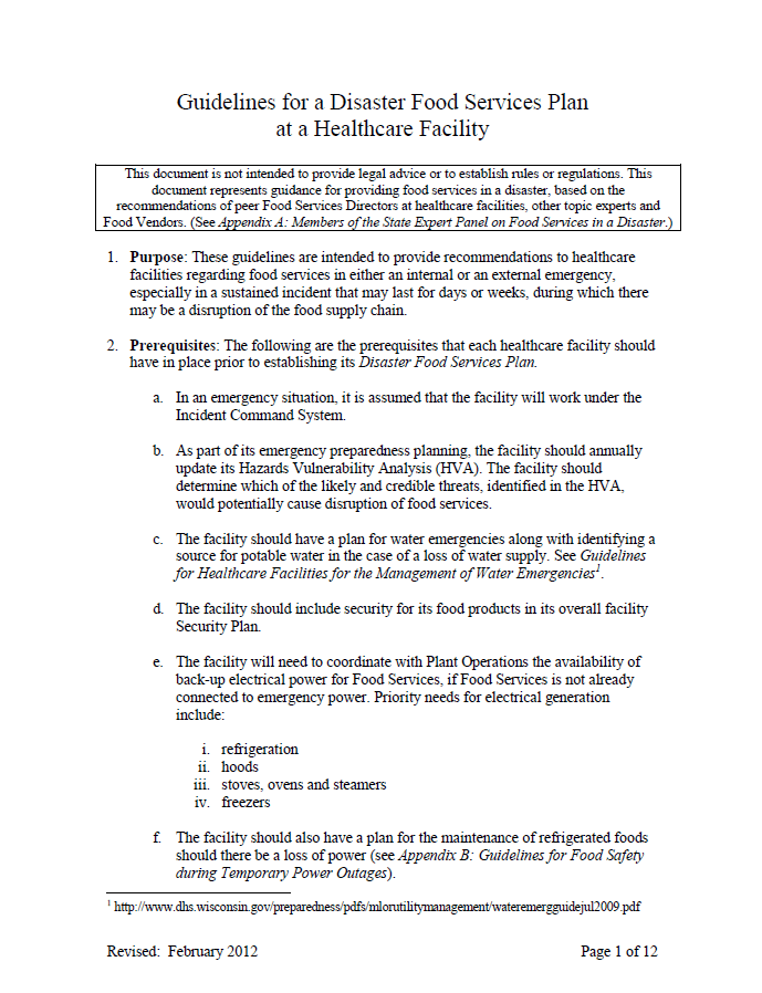Guidelines for recommendations in healthcare facilities for either internal or external emergency food services plan.
