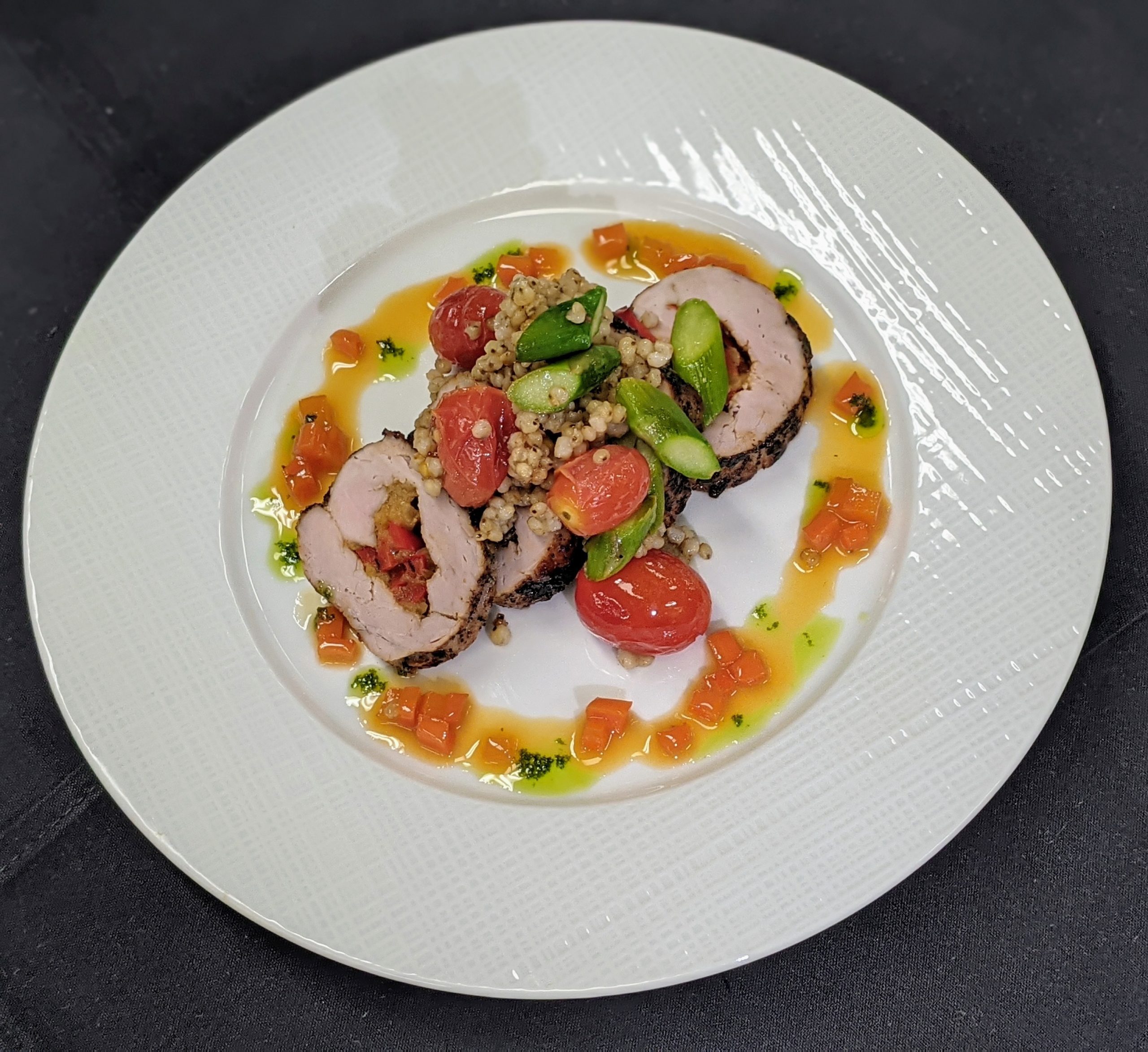Dish description: Roasted pork tenderloin stuffed with grilled peaches and julienned red peppers served with a sorghum, asparagus and roasted tomato salad and finished with a roasted carrot and grapefruit gastrique