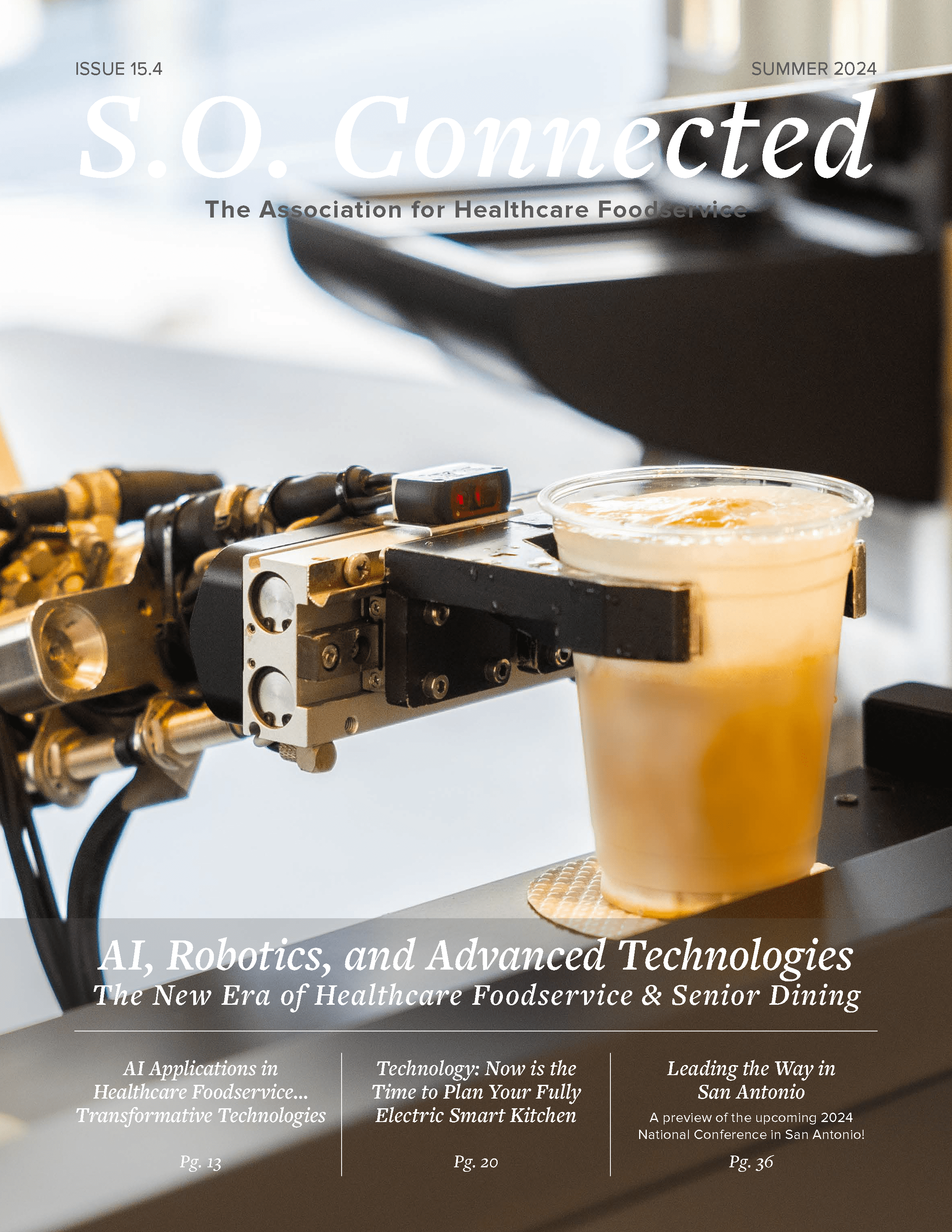 The fourth issue of volume 15 of S.O. Connected. Titled "AI, Robotics, and Advanced Technologies: The New Era of Healthcare Foodservice & Senior Dining". Feature articles: AI Applications Healthcare Foodservice... Transformative Technologies; Technology: Now is the Time to Plan Your Fully Electric Smart Kitchen; Leading the Way in San Antonio the 2024 AHF National Conference, and more.